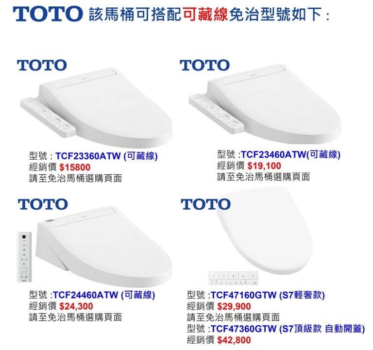 備註 : TOTO馬桶皆需另外選購便座,該款可選緩降便座+$2700,或免治馬桶便座,價格款式如下。