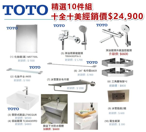 1. 包含馬桶、洗手台、水龍頭、鏡子、淋浴龍頭、衣架、置物架、包含自行購買的浴室配件。